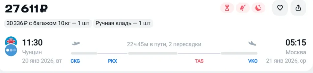 Ниже представлена информация о рейсах между Москвой и Чунцином (Примечание: эта информация приведена только для означения; расписание рейсов и цены могут измениться в любое время. При планировании поездки в Чунцин следует проверить информацию на официальном сайте авиакомпании.).