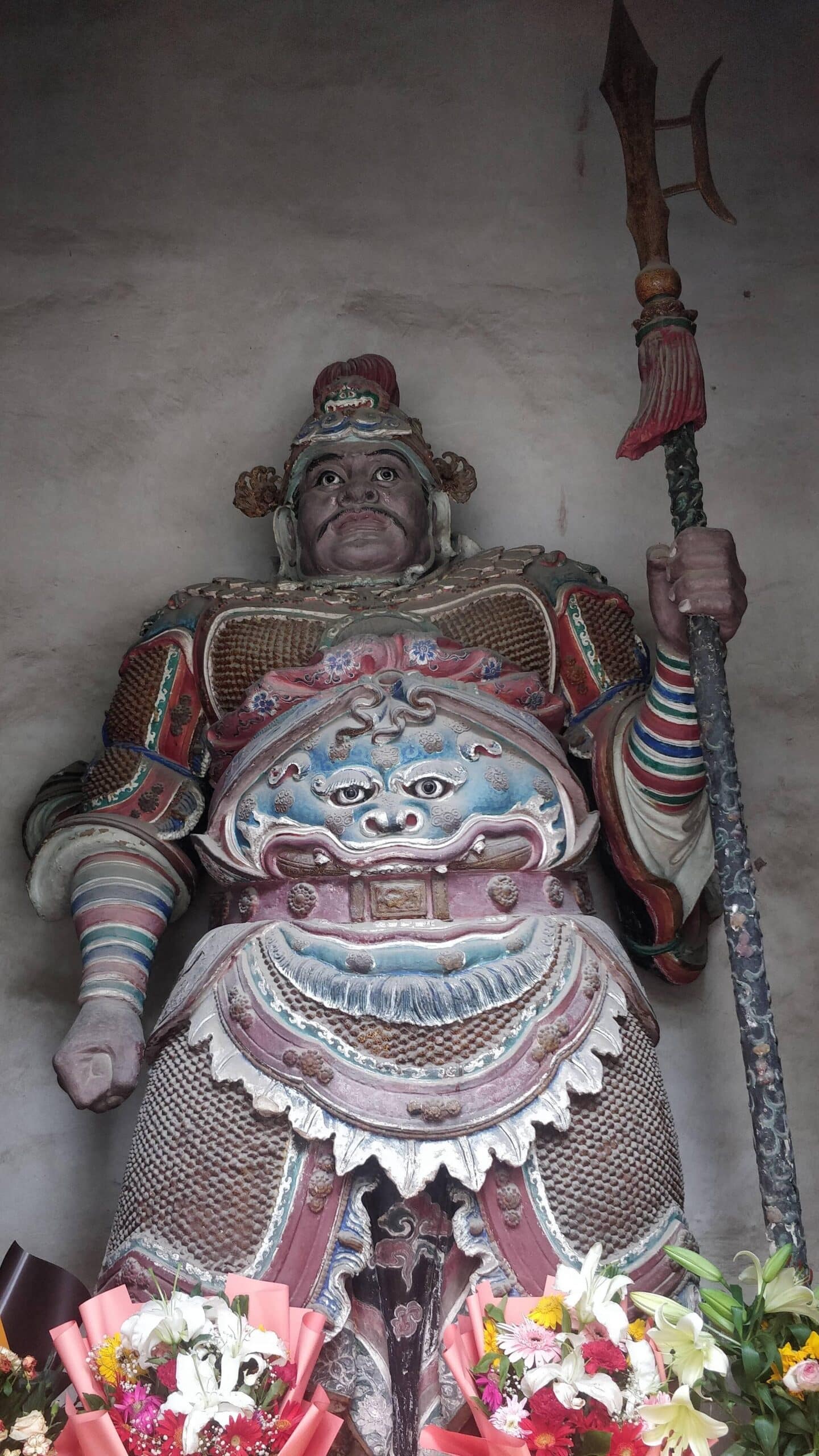 В этом зале находится статуя Майтрейи, известного в Китае как Смеющийся Будда. Он всегда улыбается или смеется над чем-то другим. Его фигура в китайской культуре является символом удовлетворенности и изобилия. Четыре «Небесных короля» охраняют Смеющегося Будду с восточной и западной сторон. Над статуей Будды находится большая позолоченная деревянная святыня времен династии Цин (1644-1912), на которой вырезано более 50 драконов.